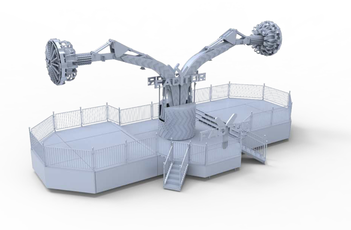 繞垂直軸旋轉(zhuǎn)、座艙繞支臂軸旋轉(zhuǎn)的陀螺類游樂(lè)設(shè)施;大臂向上拉升,到達(dá)上限位置后,座艙旋轉(zhuǎn);傾斜運(yùn)行、俯瞰大地,體驗(yàn)翻倍;