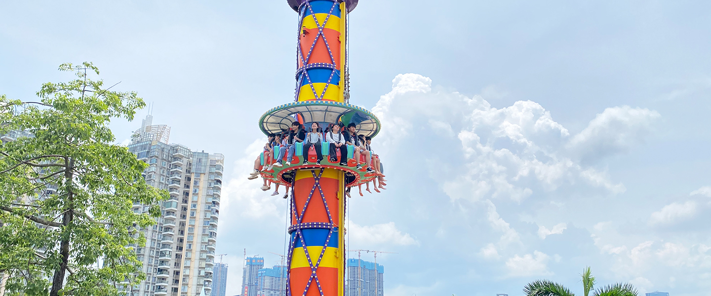旋轉(zhuǎn)太空梭集傳統(tǒng)跳樓機(jī)豎直升降運(yùn)動(dòng)和旋轉(zhuǎn)運(yùn)動(dòng)于一身,運(yùn)動(dòng)方式多樣新穎,其簡(jiǎn)形塔架可繞其自身下端轉(zhuǎn)動(dòng),滑行架跟隨塔架旋轉(zhuǎn)的同時(shí)支撐座椅沿塔架豎直軌道做升降運(yùn)動(dòng)。
